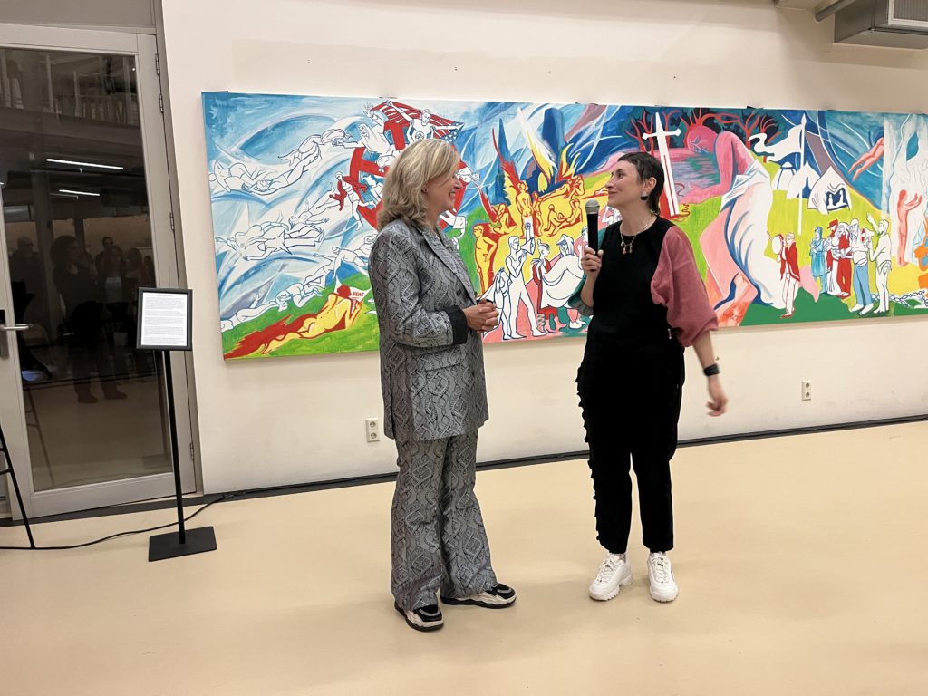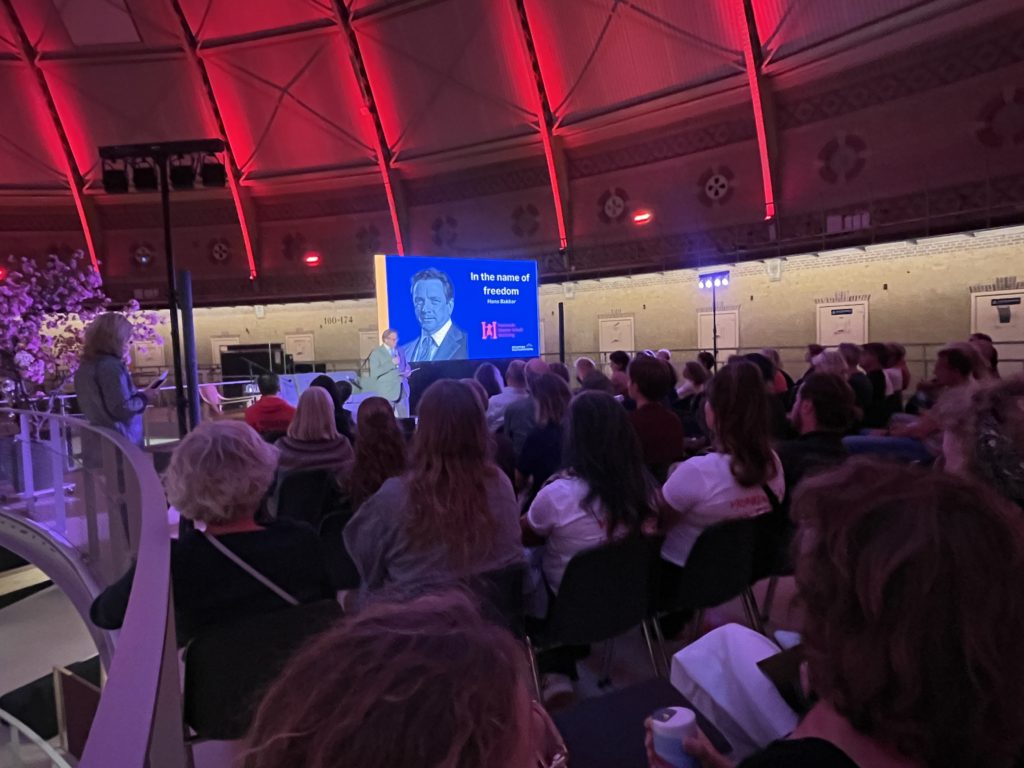 vervolgens luisterden de aanwezigen naar een indringend gesprek geleid door journalist Eva Hartog met Victoria Lomasko en Alexander Gubsky van The Moscow Times. Beide sprekers zijn gevlucht uit Rusland en delen hun aangrijpende verhalen over censuur, onderdrukking en het belang van vrije pers in een democratische samenleving.